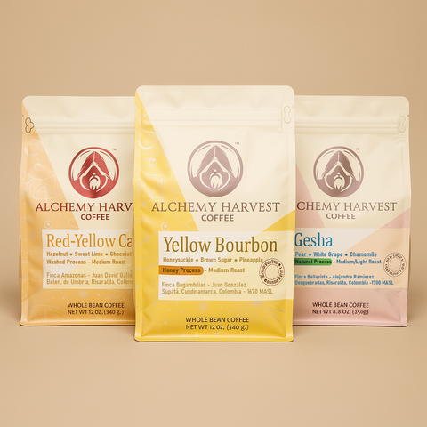 A curated trio showcasing the elegance of three celebrated coffee varietals—each processed to reveal its most refined expression. This bundle brings together Gesha, Red & Yellow Caturra, and Yellow Bourbon, offering a sensory journey through florals, sweetness, and nuanced structure. Ideal for enthusiasts who appreciate clarity, balance, and the quiet sophistication of high quality coffees.